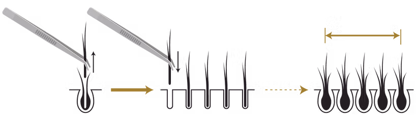 Unlike traditional hair transplant methods such as FUE, our patented technique enables full regrowth of donor hair, yielding natural, high-density results, an almost pain-free procedure and faster recovery time.